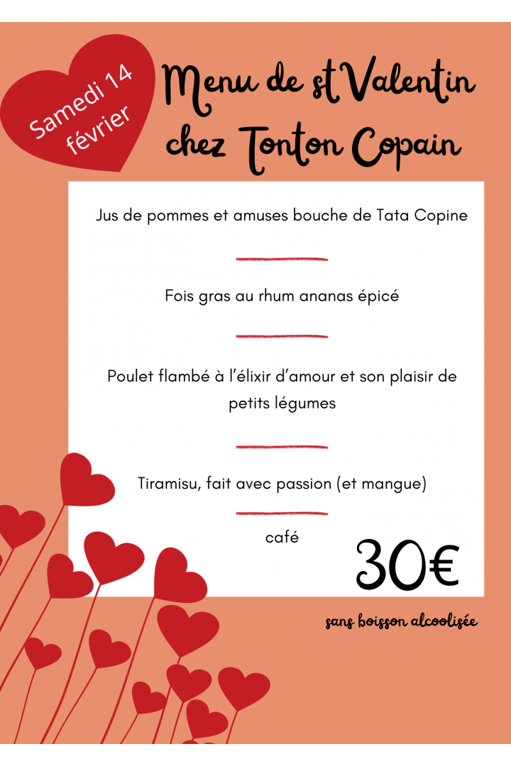 St Valentin à la fabrique de rhums le temps d’un repas avec votre moitié menu décrit sur l'affiche.